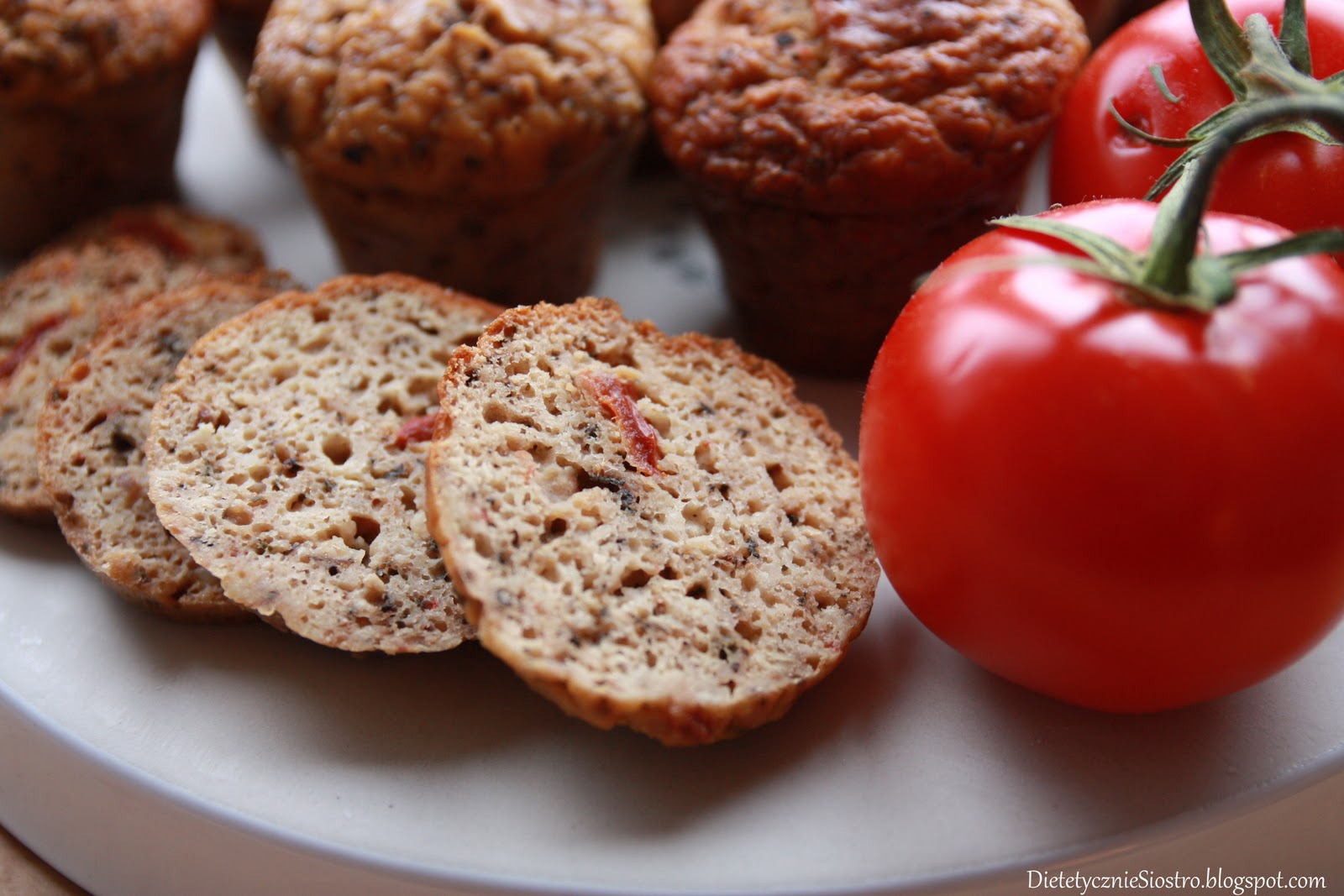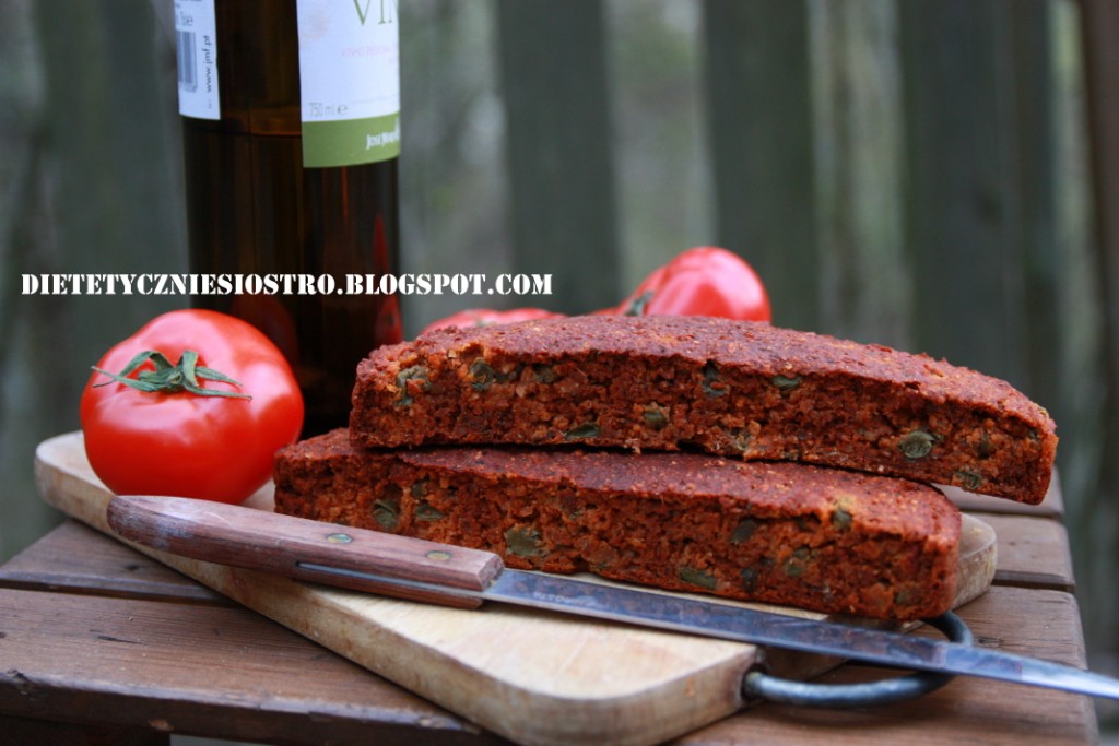 - Pomidory kroimy w małe paseczki, szatkujemy szczypior i mieszamy z suchymi składnikami. Dodajemy białka, a następnie stopniowo dolewamy wody, aż masa będzie taka jak na placki.