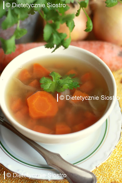 Przygotowując ten post zastanawiałam się nad tym, czy pisać że proponuję rosół dietetyczny, bo przecież jakkolwiek zupy dietetyczne z reguły nie są, to jednak rosół - czy jest na "kiju", czy na wołowinie czy na indyku to w sumie jest podobnie kaloryczny i jest najlżejszą kalorycznie zupą.